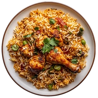 Layered basmati rice and spiced chicken slow-cooked for rich, aromatic flavor.